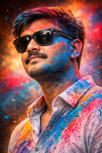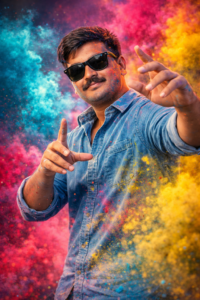 Prompt – A trendy young man wearing sunglasses and a denim shirt posing dynamically while surrounded by vibrant clouds of colored powder (cyan, pink, and yellow) exploding around him, festive Holi-style atmosphere, expressive hand pose, stylish haircut, soft smile, high contrast lighting, colorful smoke effects, studio-quality composite, sharp focus on subject, vivid saturation, cinematic color grading, modern fashion portrait, ultra-detailed, 4K, shallow depth of field, creative color splash photography