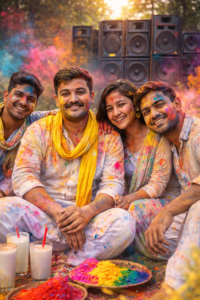 Prompt – Create an image of this guy wearing white kurta pajama and yellow scarf around the neck sit in a garden with some friends. Full of gulal and many other holi colours, some gulal and holi colour also placed there with some glasses of lassi and in bg a full setup of huge sound boxes. Gulal and holi colour flowing everywhere. All faces and clothes fully coloured with many Holi colours.