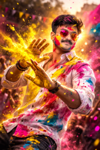 Prompt тАУ Ultra-realistic cinematic Holi action close-up portrait of a stylish young Indian man in a dynamic side pose, wearing colorful reflective sunglasses. SAME energetic pose тАУ head slightly turned to the side, smiling confidently, both hands raised in front of his ce as if shielding himself while vibrant yellow gulal bursts powerfully toward him. He is wearing a white shirt. His face, hair, beard, and white shirt are heavily covered with thick multicolor Holi powders (yellow, pink,