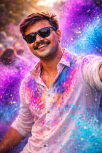 Prompt – A young man natural joyful smile as a cloud of vibrant neon purple and sky-blue Holi powder explodes dramatically around him. wearing a crisp white kurta and sunglasses that are turning into a chaotic canvas of colors. Water droplets are suspended mid-air. candid expression, eyes sparkling with pure happiness. Festive energy radiates through his relaxed posture and bright smile. The background features a soft bokeh blur of a lively Holi crowd. Cinematic backlighting creates a glowing rim light