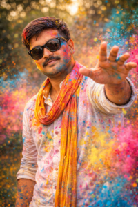 Prompt – Ultra-realistic Cinematic Holi Portrait Of A Young Man (Early 20s) With The Same Face As The Uploaded Image. He Is Wearing A White Kurta With A Long Scarf/Dupatta And Stylish Sunglasses Covered In Colorful Gulal Powder. He Raises One Hand Forward As Bright Color Dust Explodes Dramatically In The Air Around Him. Soft Expression With Eyes Slightly Closed, Light Beard. Outdoor Background With Dreamy Bokeh., Vibrant Holi Festival Vibe, Shallow Depth Of Field, Dynamic Color Particles, High