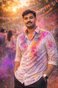 Prompt – Ultra-realistic cinematic DSLR portrait of a young Indian male (exact face match from reference). Subject standing confidently, both hands casually in pockets. Relaxed royal posture calm dominant expression. White shirt richly splashed with Holi colors, elegant yet powerful look. Soft crowd blur behind, colorful flags and powder in air. Golden hour lighting with cinematic color grading. DSLR, 85mm lens, f/1.8, shallow DOF, ultra-realistic, full HD professional photography