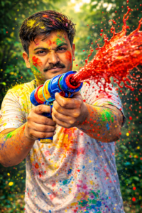 Prompt – A man with a determined expression, his face smeared with vibrant yellow, green, and red Holi powder. He is holding a water gun, from which a dynamic splash of bright red liquid erupts forward, frozen in mid-air. His white t-shirt is also speckled with colors? The background is a soft-focus blur of green foliage, suggesting an outdoor setting during the Holi festival. The lighting highlights the explosive motion of the water and the intensity of the man’s gaze. nanoBanana style.