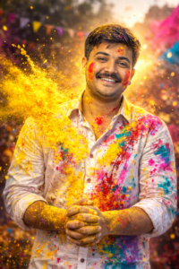 Prompt – Ultra-realistic Holi festival portrait using my uploaded photo as the face reference, joyful young man smiling naturally, hands clasped together in front of belly 3/4th right covered in bright yellow Holi powder, vibrant yellow color powder exploding and flying across the frame, white button-up shirt splashed with multicolor paint stains (yellow, red, blue, pink, purple, green), red powder streak on cheek, playful festive expression. Use uploaded face.