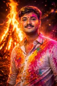 Prompt – Ultra-realistic cinematic portrait of me with my exact face features, standing near a massive Holika Dahan bonfire at night, tall sacred flames rising behind me, dramatic warm golden firelight illuminating one side of my face, the other side lit with subtle magenta festival lighting, colorful Holi gulal powder (pink, yellow, orange) spread across my face and hair, dynamic powder particles floating in the air, intense yet peaceful expression, slightly open mouth energetic vibe